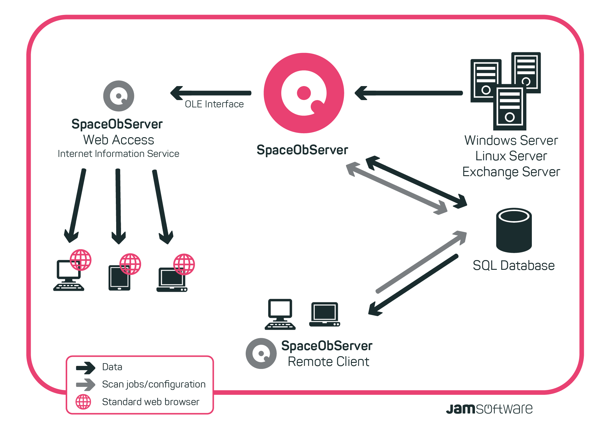 Der „SpaceObServer Client Access“ wird in der Regel auf dem PC des Endanwenders (z. B. dem PC des Administrators) installiert und verbindet sich mit der Datenbank, in der Sie die Scan-Informationen gespeichert haben.